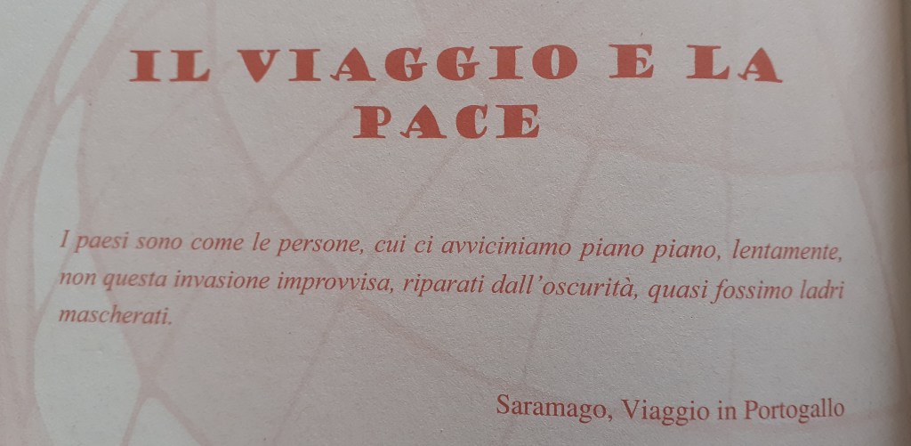 E infatti parte di quel lavoro era dedicato ala forza del viaggio come veicolo per la pace, l’incontro fra popoli è l’unico viatico contro le diffidenze, i pregiudizi, gli inutili rancori, i troppi “ismi” che ci pervadono.