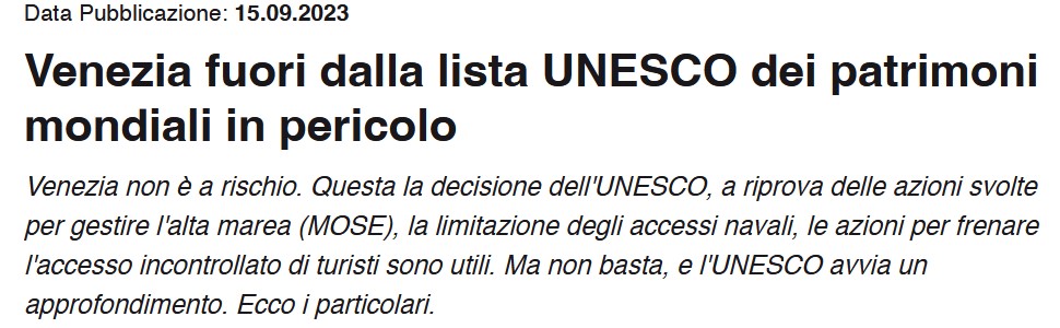 E che sia più una questione di opportunità e di possibili fondi che auspicano una maggiore competitività turistica è lecito pensarlo, bastava leggere poco tempo addietro le preoccupazioni a Venezia che ha rischiato di essere inserita nella lista dei patrimoni a rischio depennamento.