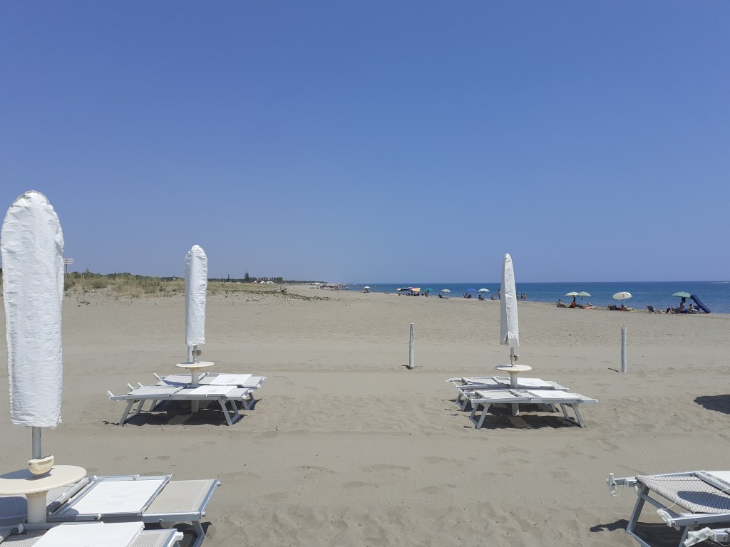 Getto uno sguardo sulle vicine spiagge libere. L’arenile prosegue a perdita d’occhio per diversi chilometri, quasi tutti sabbiosi e con ampi tratti di spiaggia libera. Calcolo un 70 ombrelloni in 2 chilometri, sono tutti disposti in riva al mare, aliasi in un’ipotetica prima fila. il resto della spiaggia è vuoto. Intravedo in lontananza altri due lidi e so che ce ne sono altri 2 poco dopo afferenti a resort. Stimo un 700 persone in tutto, lidi compresi.