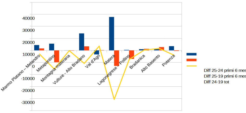 Le proiezioni dei primi 6 mesi del 2025 rispetto al passato mostrano una situazione variegata, la linea gialla segna il gap fra il 2024 e il 2019, il resto sono le tendenze (confronti sui primi 6 mesi). I segnali ci dicono che Matera e l’area del Vulture hanno iniziato molto bene il 2025, seguiti in modo minore da altre aree. Male solo la Val d’Agri. Matera poi, a differenza del Vulture, non sembra poter recuperare le quote del 2019 ma come detto in quel caso si è trattato di un boom difficilmente confrontabile. Nel resto della Regione il confronto ha senso farlo e si nota in modo marcato il non recupero di flussi nel metapontino e nell’area Lagonegrese-Pollino.