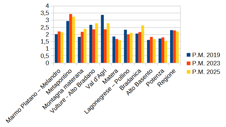 Preoccupante il continuo abbassamento della permanenza media a livello regionale, passato da 2,29 dei primi 6 mesi del 2019 al 2,20 dello stesso periodo 2025, con Matera che si assesta a un triste 1.50. Nelle altre aree la situazione è variegata, come si può desumere dal grafico. L’abbassamento della permanenza media comporta un maggior dispendio di energie e di risorse, il che significa costi maggiori a parità di presenze, dunque minori ricavi.
