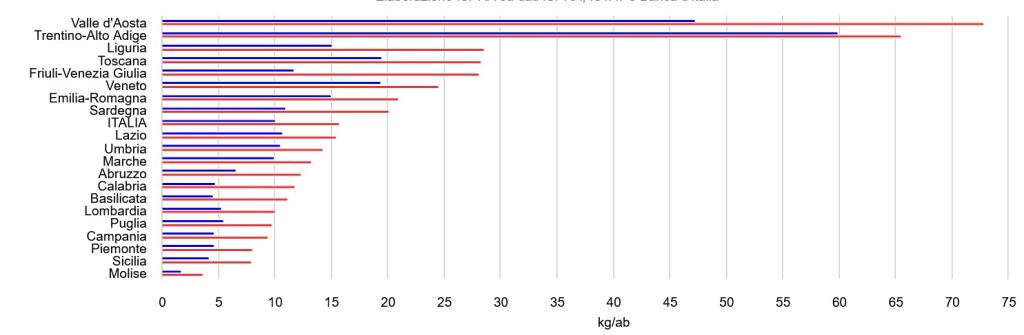 La Campania ha una quota di 9,43 kg di rifiuti per abitante equivalente (dato dalla somma dei residenti + turisti ed escursionisti), la Puglia 9,76, la media italiana è 15,72 causa valori importanti in Valle d’Aosta e Trentino.